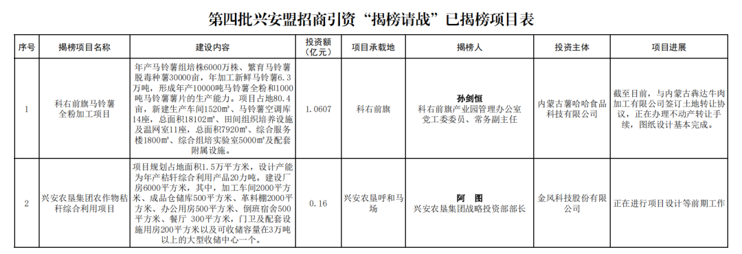 2024年2月23日,经盟委、行署研究,发布《中共兴安盟委员会办公室兴安盟行政公署办公室关于印发 <兴安盟招商引资“揭榜请战+主帅出征”专项行动实施方案> 的通知》(兴党办发〔2024〕4号)。截至目前,各旗县市委、人民政府以及盟开发区、盟农垦事业发展中心主要负责同志共揭榜项目14个,总投资325.9亿元;各地、各部门干部共揭榜了项目27个,总投资193.44亿元。现将第四批兴安盟招商引资“揭榜请战”项目公示如下。 兴安盟招商引资“揭榜请战+主帅出征”专项行动实施方案>
