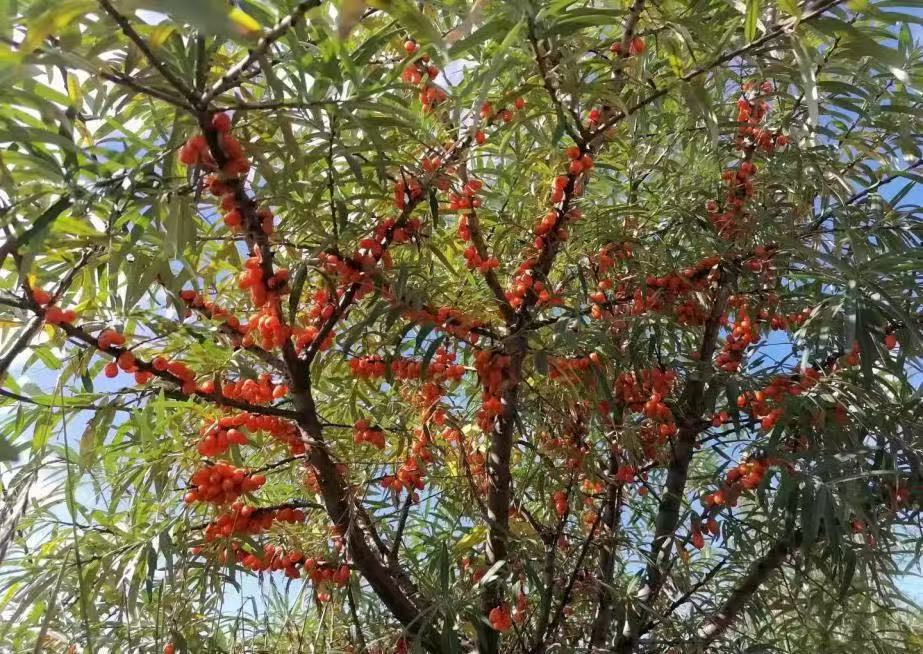 沙棘是地球上最古老的植物之一,其固有的营养和药用价值极高,含有190种以上的生物活性成分,是少有的集蛋白质、不饱和脂肪酸、维生素、类黄酮物质(V)于P一体的神奇植物,被称为“维生素宝库”。此外,它富含428种活性成分,VC含量是猕猴桃的8倍、胡萝卜素是蓝莓的120倍。